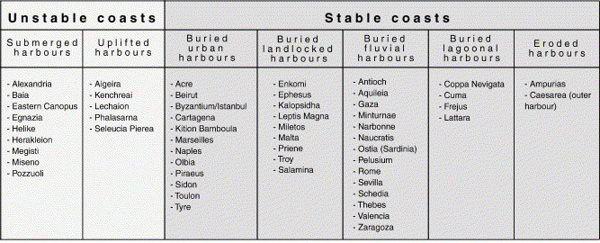 a) Puertos urbanos enterrados. Las áreas portuarias de las ciudades todavía son completamente funcionales hoy en día, pero el corazón de los antiguos centros se encuentra debajo de las urbes modernas. Algunos ejemplos son Beirut, Bizancio/Estambul, Cartagena, Marsella, Nápoles, El Pireo, Sidón y Tolón. Las rápidas tasas de acumulación de sedimentos, de 10 a 20 mm/año durante las épocas antigua y medieval, han llevado a la sedimentación de los márgenes de la cuenca, que se han dislocado gradualmente hacia el mar.