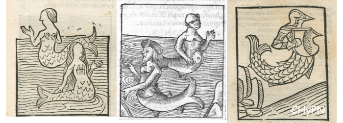 c) En tercer lugar, los seres fantásticos, que comparten características de seres humanos y de animales, que según las leyendas viven en el mar. Son las nereidas, sirenas y tritones. Representan una parte del universo mítico medieval, que en unos decenios pasarían a dibujarse en las cartas náuticas y portulanos.