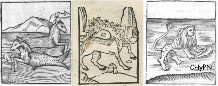 b) En segundo lugar incluimos los que existían, pero que el autor no había visto nunca, y, sin embargo, se atrevió a dibujar. Algunos son el león marino, hipopótamo, caballo de mar o lobo marino. El parecido con la realidad está muy lejano.