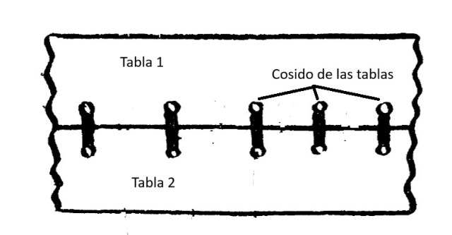 Cuando se pensó en construir naves mayores, comenzó el sistema de unir tablones de madera para conseguir mayor longitud y amplitud. Se empezó entonces a utilizar el cosido de las tablas, que ha permanecido en el océano Índico hasta el siglo XX. Consistía en unirlas utilizando cabos (cuerdas) elaborados con fibras vegetales.