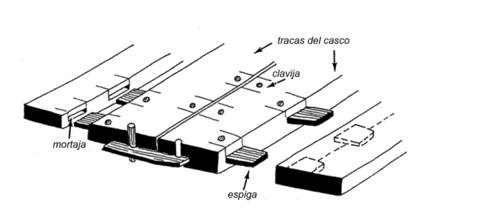 Los autores romanos, en especial Catón (s. II a. C.), atribuyen a los fenicios el sistema de «espiga y mortaja» (punicana coagmenta o coagmenta punicana, también conocido como «junta al estilo púnico»), aunque sabemos que tiene sus antecedentes en el antiguo Egipto. También nos ha llegado su uso en otras especialidades de carpintería distintas. Es decir, que se conocía, pero no se había llegado a utilizar en la construcción naval.