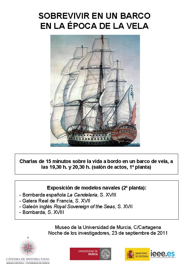 El título de la actividad será «Sobrevivir en un barco en la época de la vela». La cita es en el Museo de la Universidad de Murcia, en la Calle Cartagena. Se impartirán charlas de 15 minutos sobre cómo era la vida en un barco. Una está programada a las 19,30 y la otra a las 20,30 h., y serán en el salon de actos del Museo. El capitán de navío D. Pedro Fondevila las impartirá.